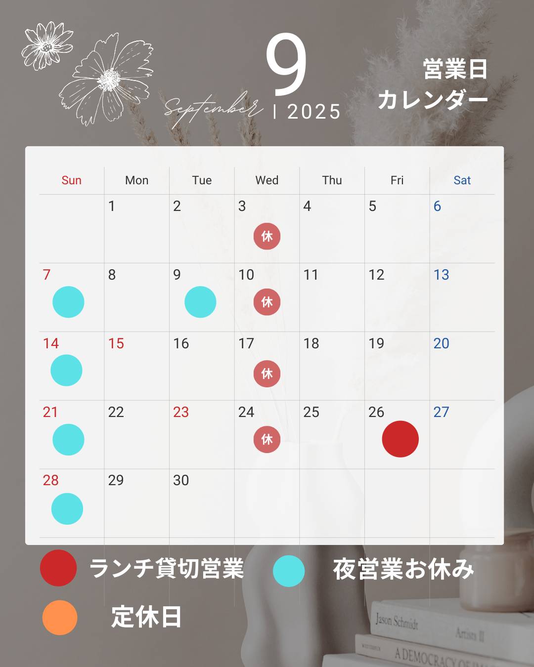 9月の定休日のお知らせ!